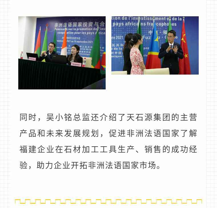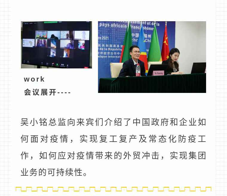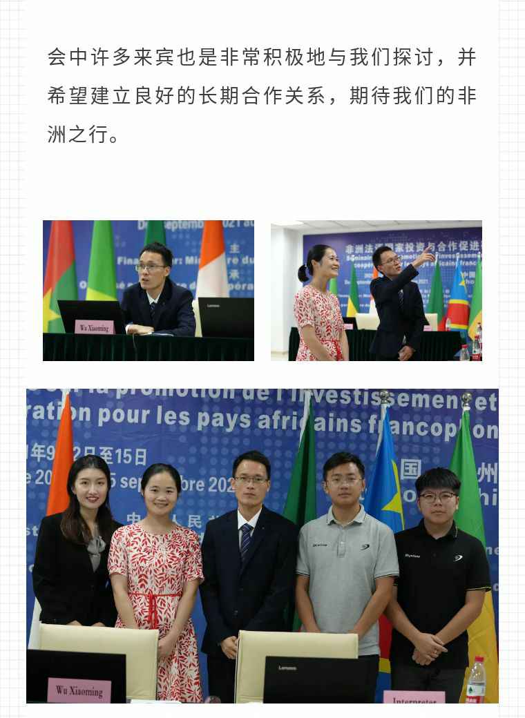 2021年9月6日,雅博app官方入口-雅博官网应福建省对外经济合作中心邀请,由非洲大区市场总监吴小铭作为代表与包括25位来自非洲法语国家经贸、投资促进政府部门官员及企业管理人员就疫情下中国企业如何应对机遇与挑战展开讨论。